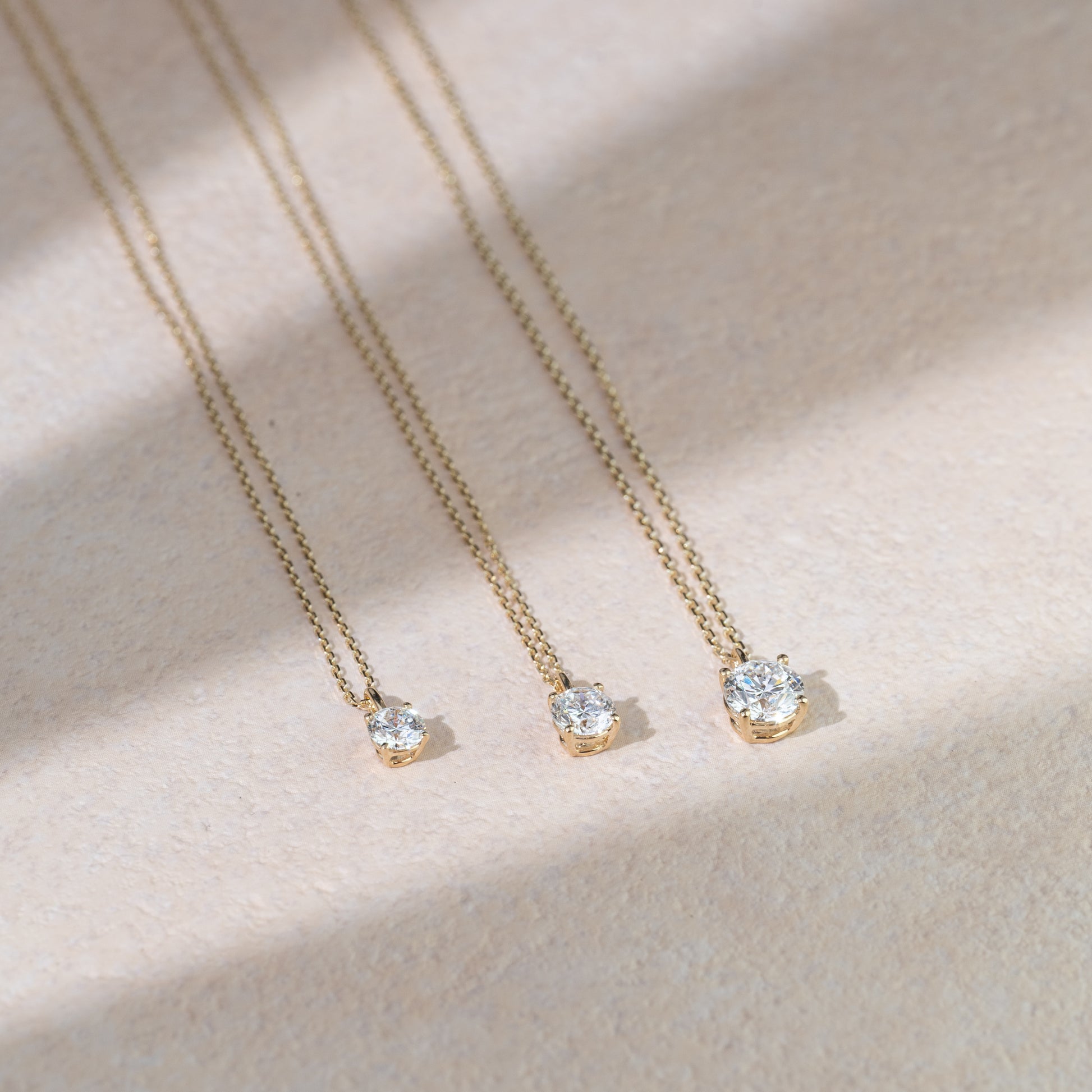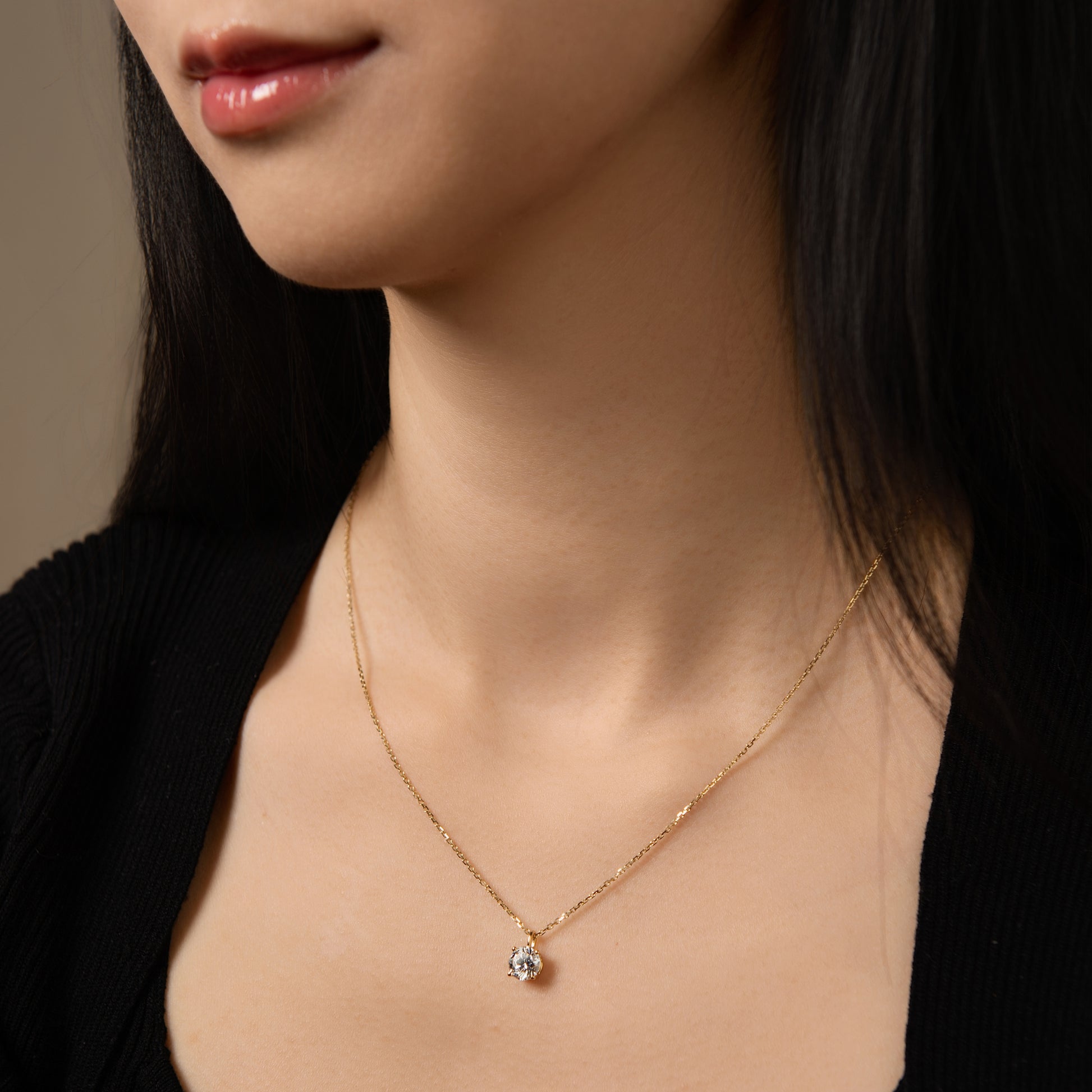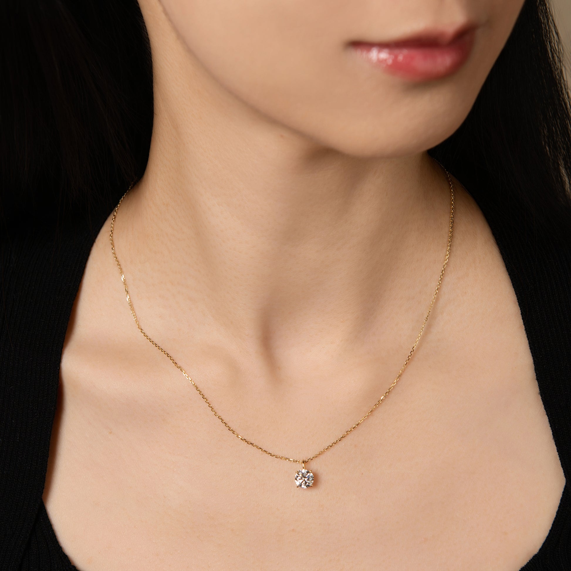 A delicate round-cut lab-grown diamond pendant, suspended on a fine gold chain. Its refined simplicity makes it the perfect everyday piece — luminous on its own, yet effortlessly layered with other necklaces for a personalized touch of elegance.