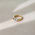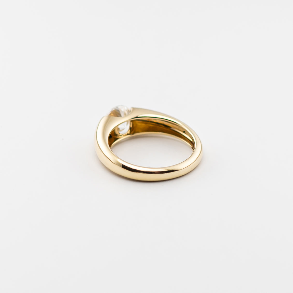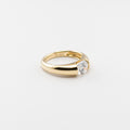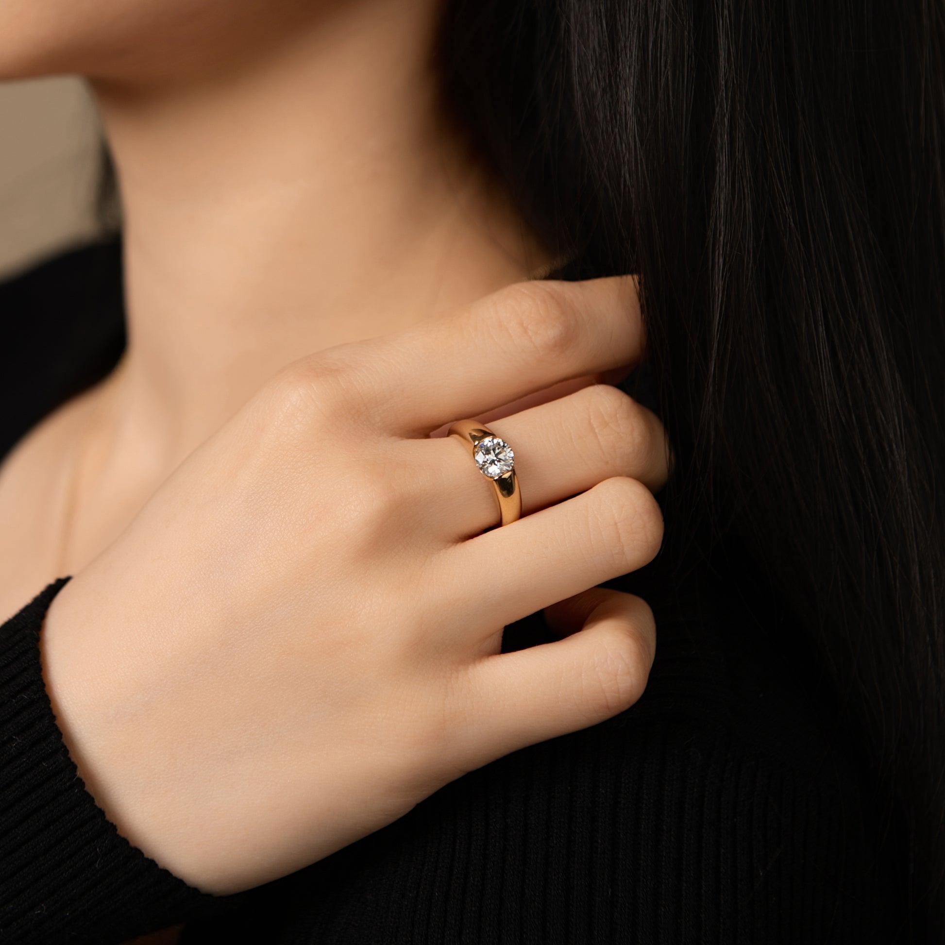Striking in its simplicity, this lab-grown diamond ring pairs a brilliant round center stone with a sculptural gold band that feels both contemporary and timeless. The bezel-style setting cradles the diamond in a smooth curve, allowing it to glow with confident clarity while giving the piece a seamless, minimalist silhouette. Bold yet refined, it’s a statement of modern elegance—perfect for those who love clean lines, effortless shine, and jewelry that stands out with quiet strength.